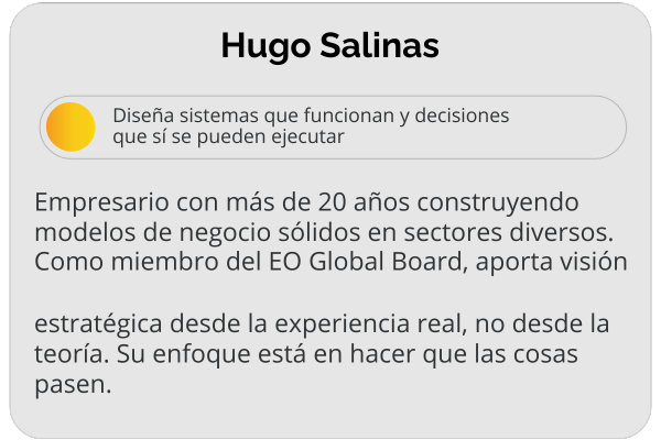 Empresario con más de 20 años construyendo modelos de negocio sólidos en sectores diversos. Como miembro del EO Global Board, aporta visión estratégica desde la experiencia real, no desde la teoría. Su enfoque está en hacer que las cosas pasen.