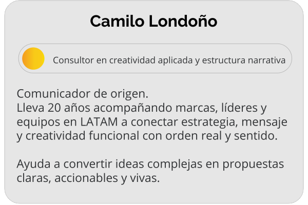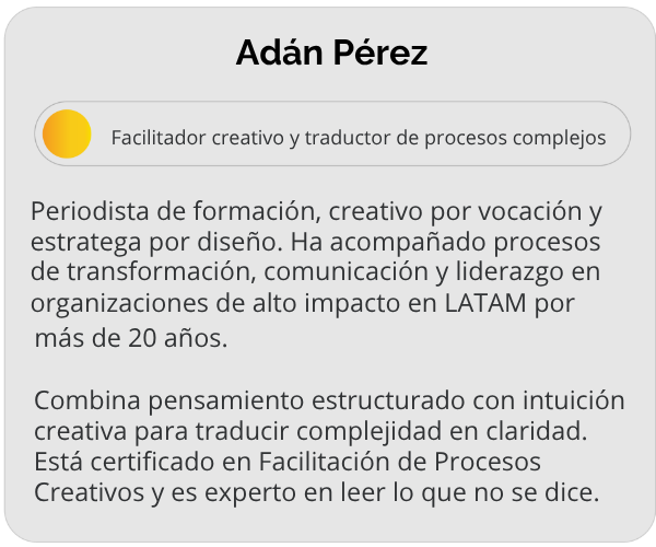 Combina pensamiento estructurado con intuición creativa para traducir complejidad en claridad. Está certificado en Facilitación de Procesos Creativos y es experto en leer lo que no se dice.